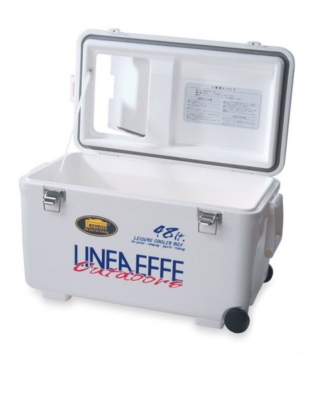 Geleira Lineaeffe, composta por uma tampa com selo hermético, os fechos e as dobradiças são em aço inoxidável. Contém uma porta com porta-iscas que se comunica com o compartimento interno, rodas, correia transportadora e um bujão de drenagem na parte traseira. Dimensões: 58 x 34 x 36cm