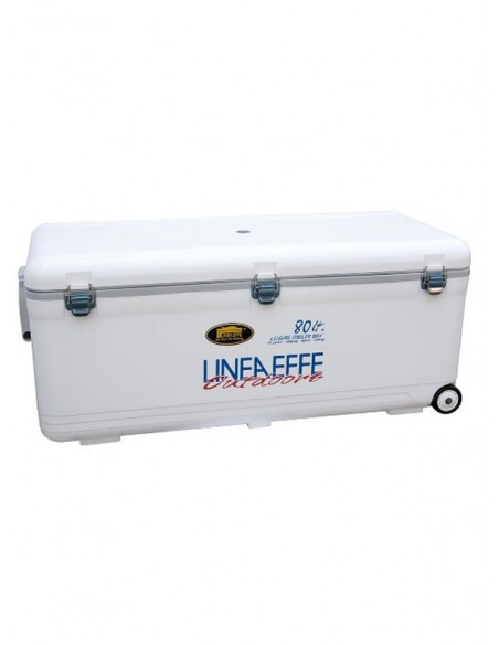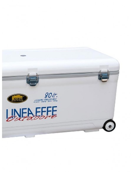 Geleira Lineaeffe, composta por uma tampa com selo hermético, os fechos e as dobradiças são em aço inoxidável. Contém rodas resistentes e um bujão de drenagem na parte traseira. Dimensões: 87x36x39cm