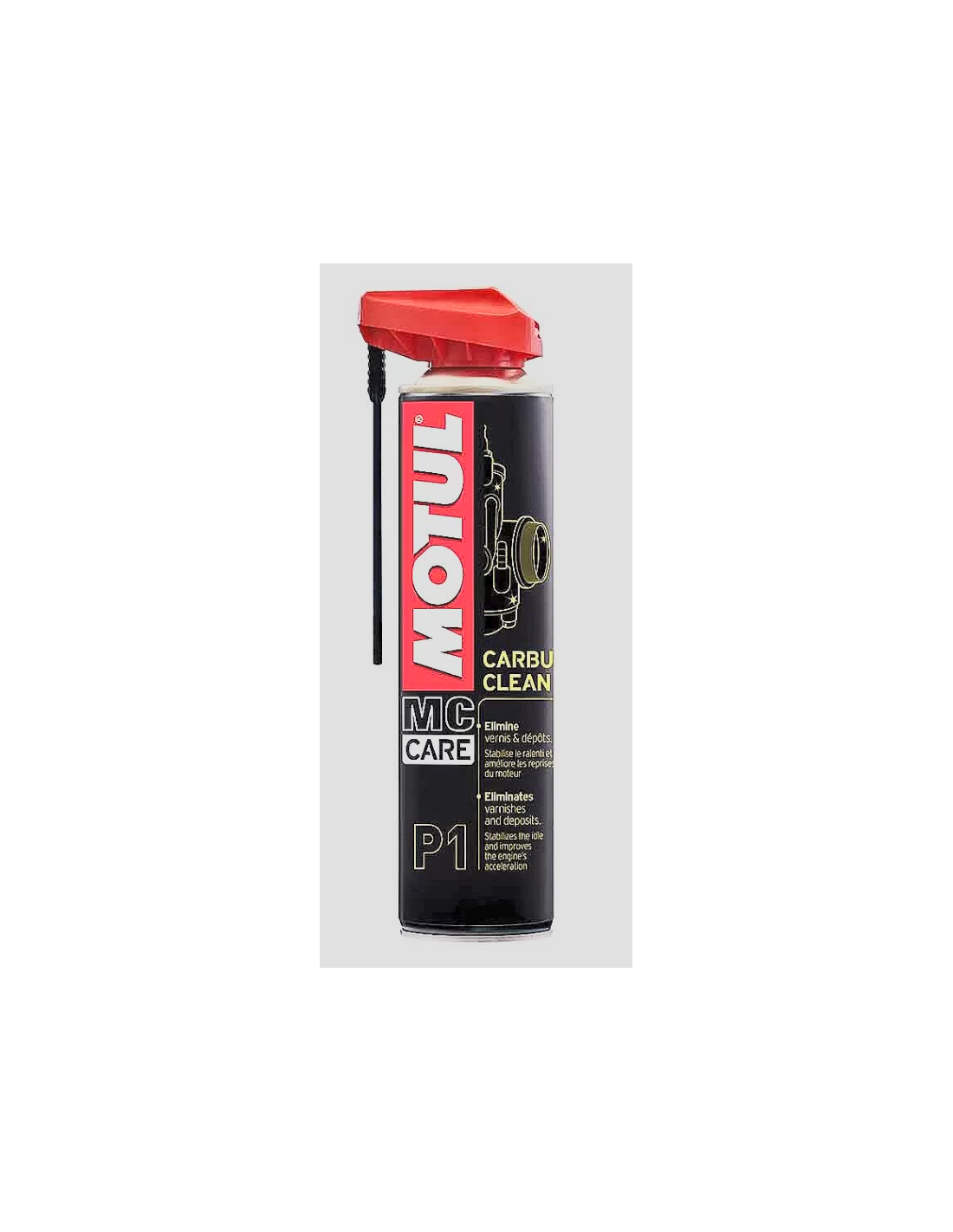 O Motul Carbu Clean P1 400ml é um spray especialmente desenvolvido para a limpeza profunda de carburadores e sistemas de admissão, eliminando eficazmente depósitos de goma, verniz e resíduos que comprometem o desempenho do motor. A sua fórmula de alta eficácia dissolve sujidade difícil, garantindo um funcionamento mais regular e melhor resposta do motor.
