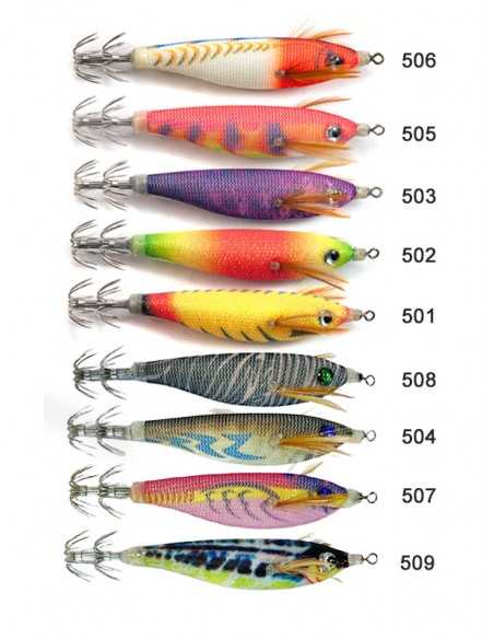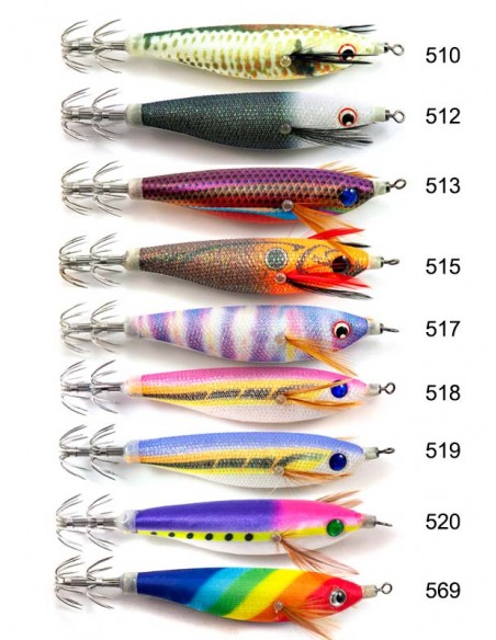 EGI TORI Os corpos são produzidos com uma luminosidade especialmente atrativa aos cefalópodes. Cada cor dos EGI TORI foi cuidadosamente estudada para potenciar o interesse de lulas e chocos, aumentando o seu rácio de ataques. Os olhos com orla fosforescente adicionam mais um factor de atracção enquanto o posicionamento estático a 40°, mais natural numa preza, diminui o risco de prisões em fundos com muitas estruturas. Equipados com coroas de anzóis de perfil redondo em inox.