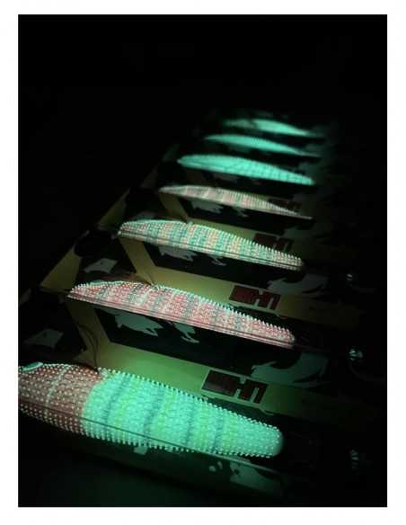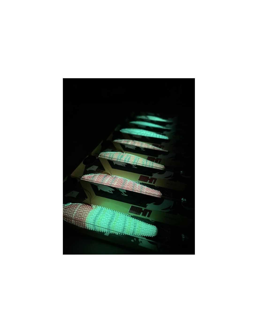 Os Ryoshi Ukimi em 95mm destacam-se a pele coberta de micropontos de borracha, o que diminui a desconfiança dos cefalópodes na hora de atacar a isca. Possuem um efeito extra luminoso com alta visibilidade noturna.